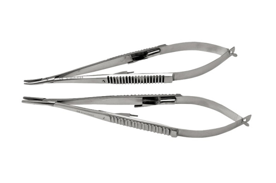 Igłotrzymacz Castroviejo o długości 14 cm, wygięty, do mikrochirurgii.